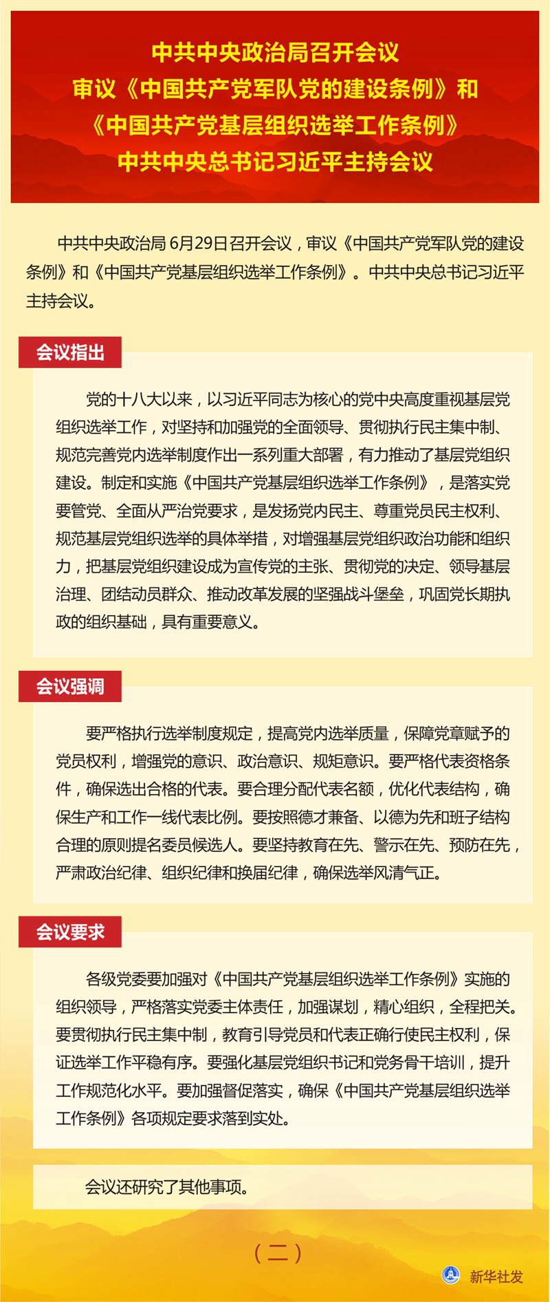 中共中央政治局召開會議 審議《中國共產(chǎn)黨軍隊黨的建設條例》和《中國共產(chǎn)黨基層組織選舉工作條例》 中共中央總書記習近平主持會議 新華社北京6月29日電 中共中央政治局6月29日召開會議,審議《中國共產(chǎn)黨軍隊黨的建設條例》和《中國共產(chǎn)黨基層組織選舉工作條例》。中共中央總書記習近平主持會議。 會議指出,黨的領導和黨的建設是人民軍隊建設發(fā)展的關鍵,關系強軍事業(yè)興衰成敗,關系黨和國家長治久安。制定《中國共產(chǎn)黨軍隊黨的建設條例》,是深入貫徹習近平新時代中國特色社會主義思想和黨的十九大精神的重要舉措,對增強“四個意識”、堅定“四個自信”、做到“兩個維護”,貫徹軍委主席負責制,對確保黨對軍隊絕對領導,確保有效履行新時代軍隊使命任務,確保人民軍隊永葆性質(zhì)、宗旨、本色,對實現(xiàn)黨在新時代的強軍目標、把人民軍隊全面建成世界一流軍隊,具有重要意義。 會議強調(diào),要毫不動搖堅持黨對軍隊絕對領導,全面深入貫徹軍委主席負責制,持續(xù)深化政治整訓,做到絕對忠誠、絕對純潔、絕對可靠。要堅持聚焦聚力備戰(zhàn)打仗,把戰(zhàn)斗力這個唯一的根本的標準貫徹到人民軍隊黨的建設全過程和各方面,推動黨的政治優(yōu)勢和組織優(yōu)勢轉(zhuǎn)化為制勝優(yōu)勢。要堅持貫徹全面從嚴治黨要求,堅定不移正風肅紀,堅決糾治形式主義、官僚主義。要堅持勇于自我革命,不斷自我凈化、自我完善、自我革新、自我提高。 會議要求,要加強《中國共產(chǎn)黨軍隊黨的建設條例》學習宣傳和貫徹落實。要突出書記隊伍和班子成員,抓好學習培訓,提高抓黨的建設的意識和能力。要強化領導督導,確?!吨袊伯a(chǎn)黨軍隊黨的建設條例》有效執(zhí)行、落地見效。 會議指出,黨的十八大以來,以習近平同志為核心的黨中央高度重視基層黨組織選舉工作,對堅持和加強黨的全面領導、貫徹執(zhí)行民主集中制、規(guī)范完善黨內(nèi)選舉制度作出一系列重大部署,有力推動了基層黨組織建設。制定和實施《中國共產(chǎn)黨基層組織選舉工作條例》,是落實黨要管黨、全面從嚴治黨要求,是發(fā)揚黨內(nèi)民主、尊重黨員民主權利、規(guī)范基層黨組織選舉的具體舉措,對增強基層黨組織政治功能和組織力,把基層黨組織建設成為宣傳黨的主張、貫徹黨的決定、領導基層治理、團結動員群眾、推動改革發(fā)展的堅強戰(zhàn)斗堡壘,鞏固黨長期執(zhí)政的組織基礎,具有重要意義。 會議強調(diào),要嚴格執(zhí)行選舉制度規(guī)定,提高黨內(nèi)選舉質(zhì)量,保障黨章賦予的黨員權利,增強黨的意識、政治意識、規(guī)矩意識。要嚴格代表資格條件,確保選出合格的代表。要合理分配代表名額,優(yōu)化代表結構,確保生產(chǎn)和工作一線代表比例。要按照德才兼?zhèn)?、以德為先和班子結構合理的原則提名委員候選人。要堅持教育在先、警示在先、預防在先,嚴肅政治紀律、組織紀律和換屆紀律,確保選舉風清氣正。 會議要求,各級黨委要加強對《中國共產(chǎn)黨基層組織選舉工作條例》實施的組織領導,嚴格落實黨委主體責任,加強謀劃,精心組織,全程把關。要貫徹執(zhí)行民主集中制,教育引導黨員和代表正確行使民主權利,保證選舉工作平穩(wěn)有序。要強化基層黨組織書記和黨務骨干培訓,提升工作規(guī)范化水平。要加強督促落實,確?!吨袊伯a(chǎn)黨基層組織選舉工作條例》各項規(guī)定要求落到實處。 會議還研究了其他事項。 |