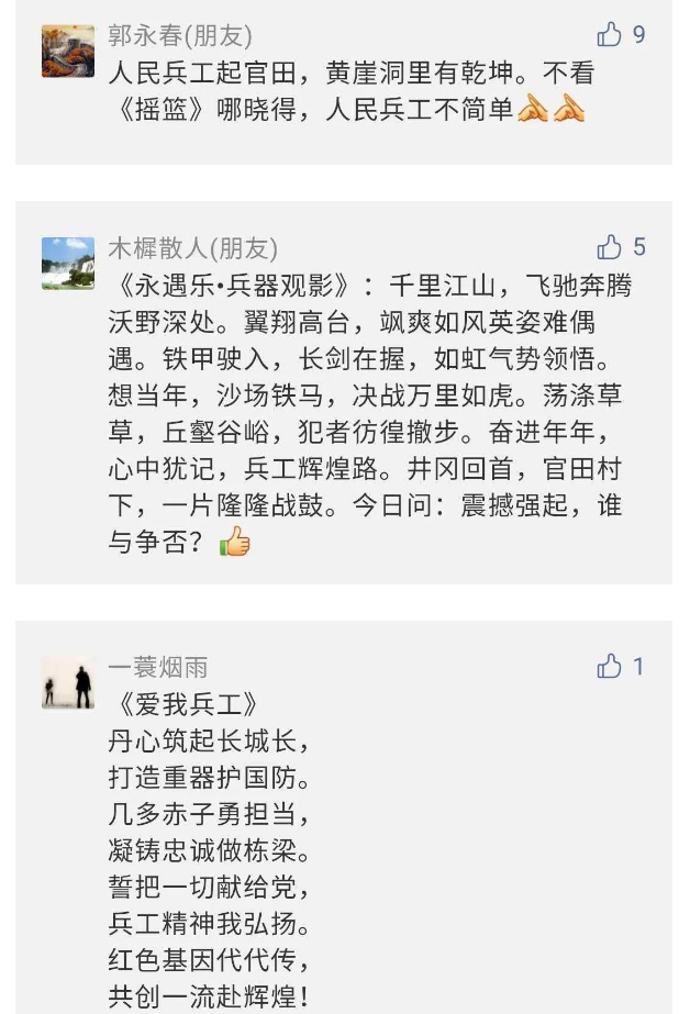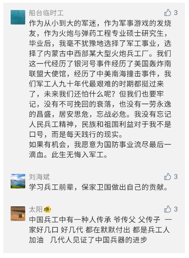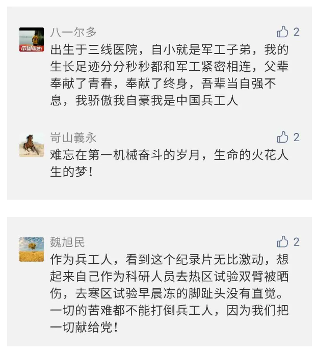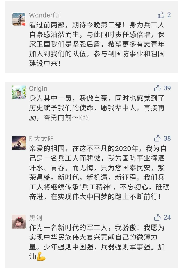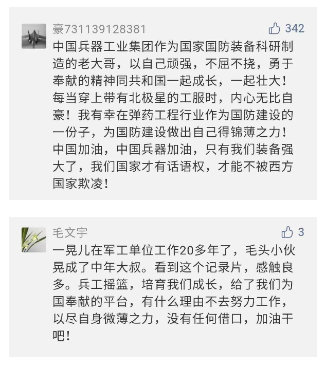 作為新時(shí)代弘揚(yáng)人民兵工精神的特色文化成果,紀(jì)錄片的播出,凝聚起廣大兵器干部職工團(tuán)結(jié)奮斗新時(shí)代磅礴力量,極大的增強(qiáng)了兵工人的自豪感,大家紛紛表達(dá)了作為軍工央企一員 “此生無悔入軍工”的使命擔(dān)當(dāng)......
