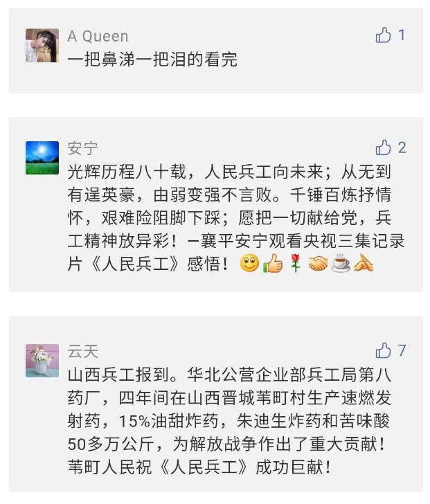 在中國共產(chǎn)黨成立九十九周年之際,由中國兵器工業(yè)集團(tuán)有限公司組織攝制、反映人民兵工在黨的領(lǐng)導(dǎo)下80余年光輝奮斗歷程、廣大兵工人弘揚(yáng)“把一切獻(xiàn)給黨”人民兵工精神的三集紀(jì)錄片《人民兵工》自7月1日-3日每晚20點(diǎn)在中央廣播電視總臺中文國際頻道(CCTV-4)《國家記憶》首播以來,在兵器系統(tǒng)和觀眾中引發(fā)強(qiáng)烈反響,很多網(wǎng)友、觀眾紛紛留言表達(dá)了自己的觀后感受。 觀眾在兵器工業(yè)集團(tuán)官微的留言區(qū)直抒了觀影感受,有的熱淚盈眶,有的心潮起伏,有的興起賦詩,有的認(rèn)為讓心靈得到凈化、思想得以提升,有的認(rèn)為是最直觀的國防教育教材......