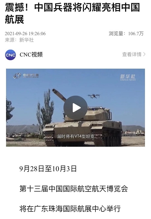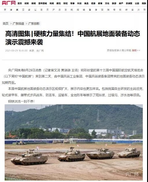 9月28日-10月3日,第十三屆中國國際航空航天博覽會在廣東珠海舉行,中國兵器工業(yè)集團有限公司作為主辦單位閃耀亮相,推出裝甲突擊、火力打擊、智能彈藥、防空反導(dǎo)、無人裝備、非傳統(tǒng)安全、軍工軍技合作等領(lǐng)域新產(chǎn)品及成體系成建制武器系統(tǒng)和解決方案,全方位展示我國陸軍外貿(mào)武器裝備的最高水平以及雄厚的科技創(chuàng)新、自主研發(fā)與先進制造能力,受到廣泛關(guān)注。 央視《新聞聯(lián)播》報道第十三屆中國航展,著重介紹了VT4主戰(zhàn)坦克,關(guān)注航展公眾日中國兵器館情況。9月28日下午央視《新聞直播間》航展特別節(jié)目《藍(lán)天盛會》邀請集團公司訪談嘉賓做客直播間對中國兵器館兵器工業(yè)集團展區(qū)等進行1小時直播;9月28日下午、10月2日下午分別對地面裝備動態(tài)表演進行兩場直播。央視《朝聞天下》、《新聞直播間》、《共同關(guān)注》、《天下財經(jīng)》、《軍事報道》、《正午國防軍事》、《軍武零距離》等相繼推出集團公司參展裝備的報道。