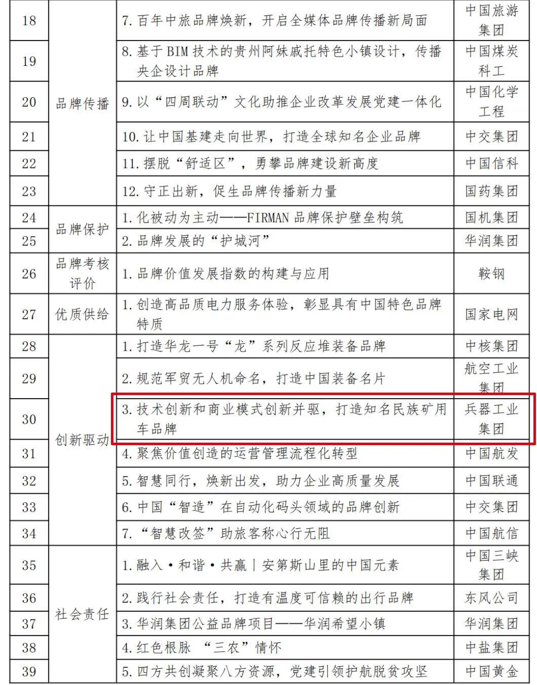 5月10日,由國家發(fā)展改革委等7部門和上海市政府共同主辦,國務(wù)院國資委特別支持的2021年中國品牌日活動(dòng)在上海舉辦。 活動(dòng)現(xiàn)場,國資委指導(dǎo)舉辦了中國企業(yè)品牌建設(shè)分論壇,會(huì)上發(fā)布了《2020年度中央企業(yè)品牌建設(shè)發(fā)展報(bào)告》、2020年度100個(gè)國有企業(yè)品牌建設(shè)典型案例和100個(gè)優(yōu)秀品牌故事。中國兵器工業(yè)集團(tuán)北重集團(tuán)的“技術(shù)創(chuàng)新和商業(yè)模式創(chuàng)新并驅(qū),打造知名民族礦用車品牌”入選2020年度100個(gè)國有企業(yè)品牌建設(shè)典型案例,中國兵器工業(yè)集團(tuán)北方公司的微電影《大山里升起的希望》入選2020年度100個(gè)優(yōu)秀品牌故事。 《2020年度中央企業(yè)品牌建設(shè)發(fā)展報(bào)告》分析了當(dāng)前中央企業(yè)加強(qiáng)品牌建設(shè)的形勢要求,從戰(zhàn)略引領(lǐng)、專業(yè)運(yùn)營、支撐保障、組織管控、全球推廣5個(gè)方面總結(jié)了中央企業(yè)年度品牌建設(shè)進(jìn)展。 2020年度100個(gè)國有企業(yè)品牌建設(shè)典型案例和100個(gè)優(yōu)秀品牌故事,匯集企業(yè)優(yōu)秀經(jīng)驗(yàn)做法,豐富國企品牌資源池,促進(jìn)企業(yè)相互學(xué)習(xí)借鑒,加快提高品牌管理專業(yè)化水平。 2020年度100個(gè)國有企業(yè) 品牌建設(shè)典型案例 來源/國資小新 |